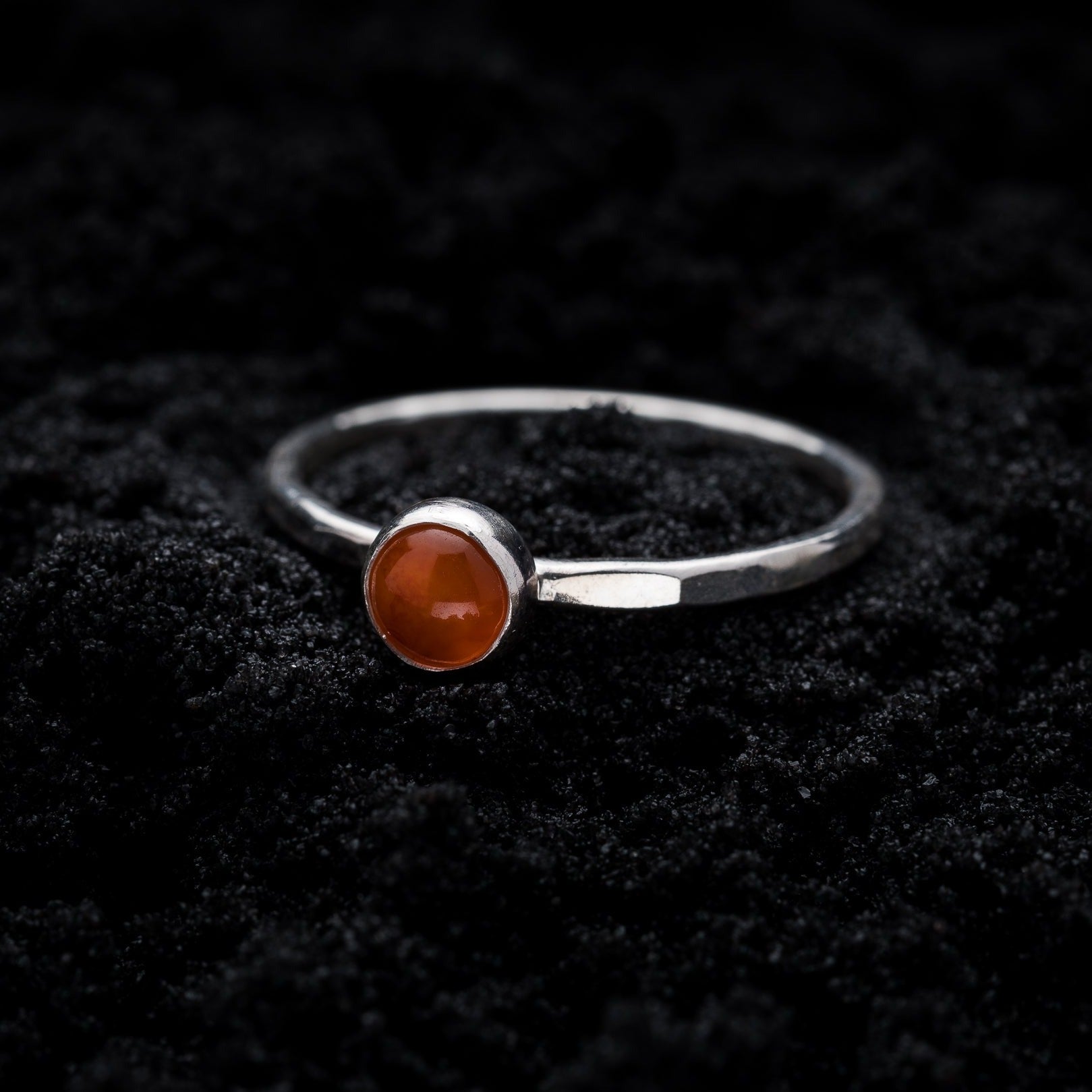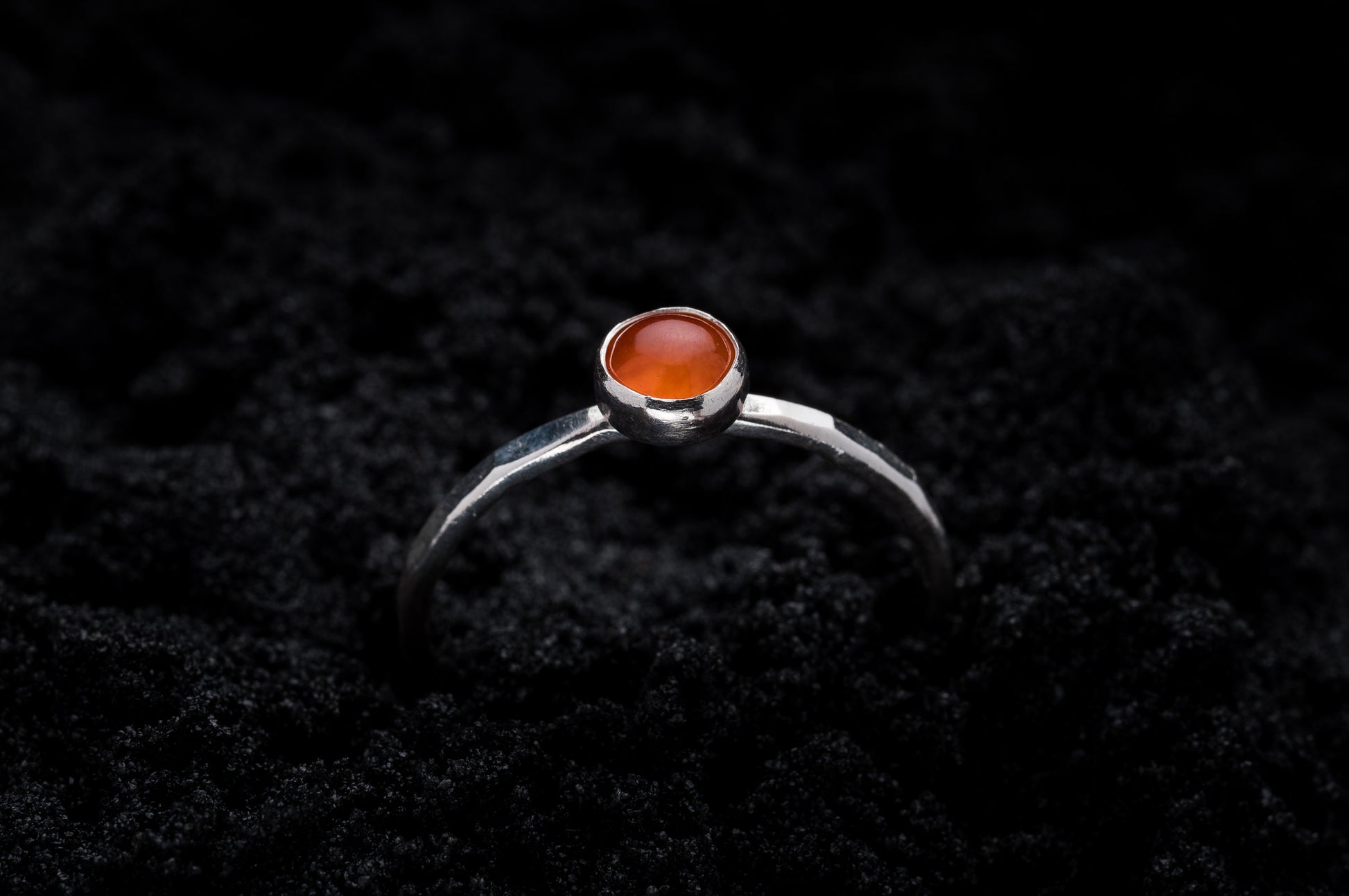 These fiery carnelians are set into simple settings which sit atop a highly polished, hammered ring which catches the light beautifully!