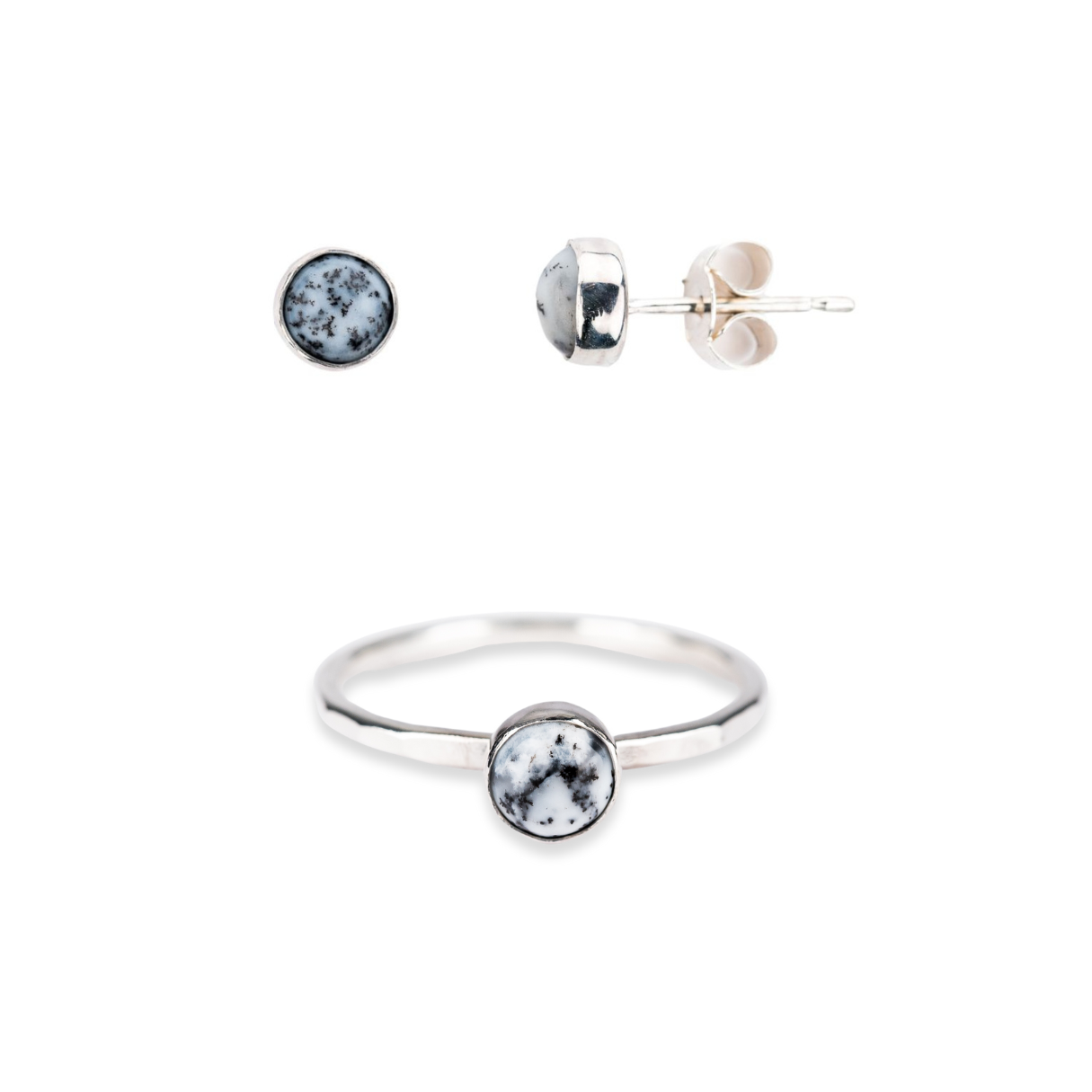 The 5mm stones are randomly chosen and set into a shiny bezel and sit atop a hammered silver band, and stud earrings, that catch the light beautifully. If you're quite particular about what your stone looks like, feel free to contact me to see what I have available and you may be able t choose your own.